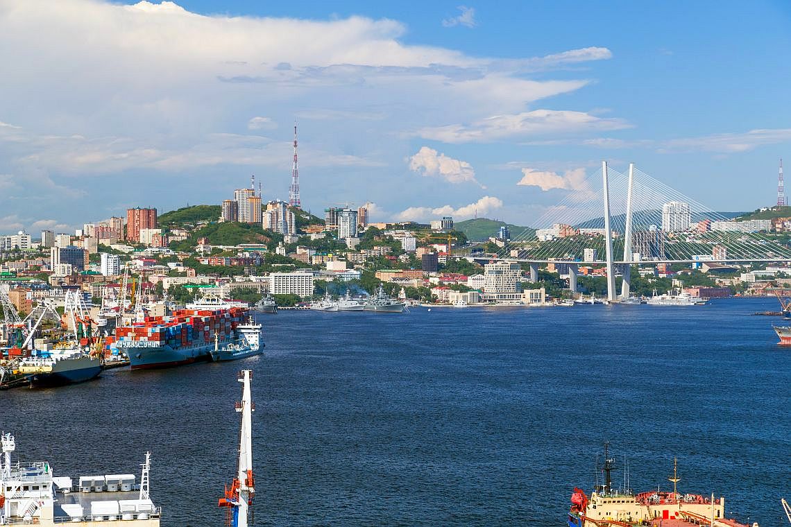 Wladiwostok ist umgeben von der Amurbucht und der Ussuribucht des Japanischen Meeres, einem Randmeer des Pazifischen Ozeans, und ist daher wirtschaftlich sehr gut gelegen.